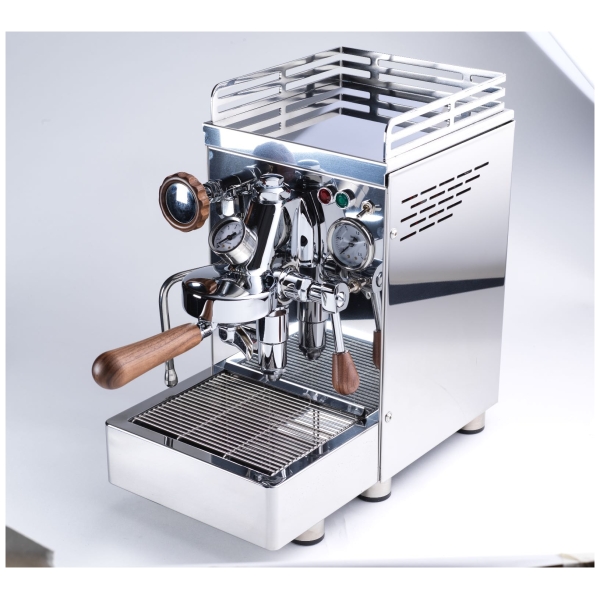 Kompakt und leistungsstark die Elba Quattro V02 ist eine Wärmetauschermaschine, die thermische Stabilität und reichlich Dampfleistung in einem platzsparenden Format bietet. Edelstahlgehäuse, dunkle Griffe und Manometer an der Brühgruppe für präzise Extraktionskontrolle.