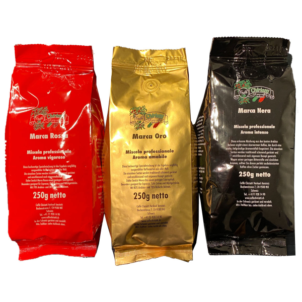 ”žMarca Oro“ enthält eine reiche, cremige und aromatische Mischung von Kaffesorten die zum grössten Teil aus Plantagen in Südamerika und Brasilien stammen. (80% Arabica, 20% erlesene Robusta Bohnen). Da die verwendeten Robustas von sehr hoher Qualität sind, ist hier keine Spur von Ruppigkeit im eleganten Aroma zu erkennen. Dafür ist der Geschmackseindruck im Vergleich zum ”žMarca Rossa“ ein wenig milder. Reich an Nuancen im lang anhaltenden Nachgeschmack empfiehlt sich“Marca Oro“ als Allroundtalent für Cafè Créme, Cappuccino und Latte Macchiato.