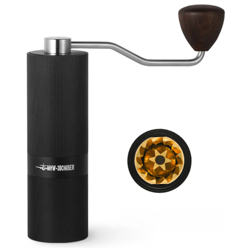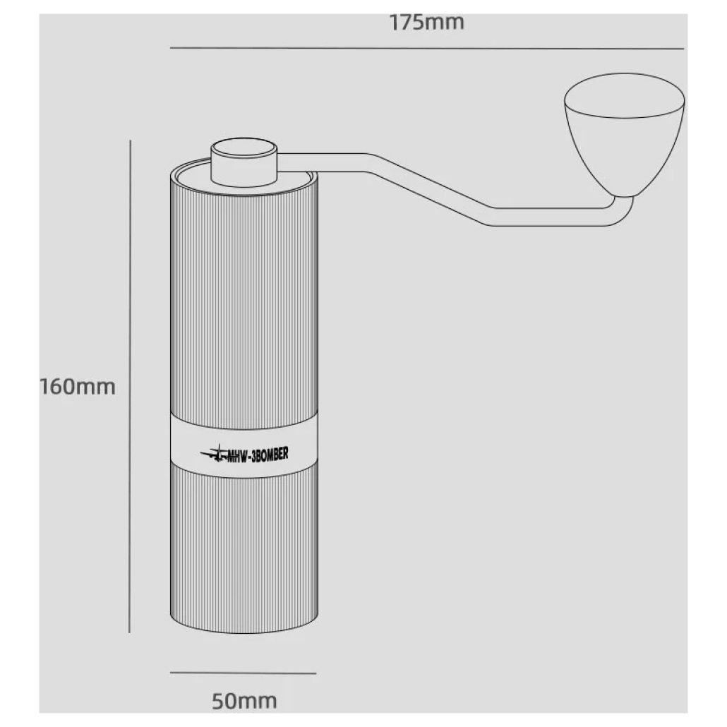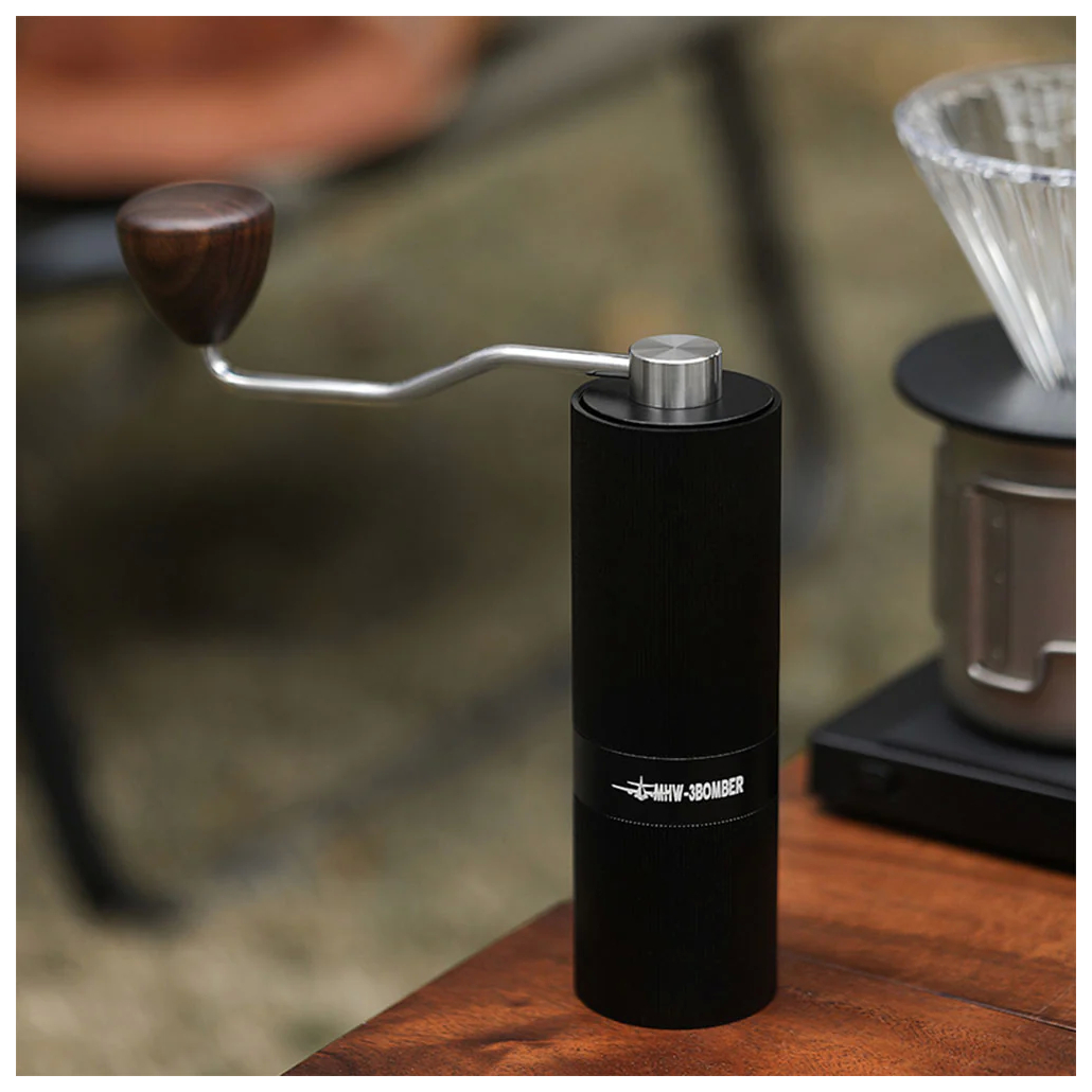 Die gesamte Mühle ist aus hochwertigen Materialien gefertigt. Das Gehäuse besteht aus einer rutschfesten Aluminiumlegierung, der Griff aus Walnussholz, das Mahlwerk aus Titanium und alle weiteren Teile wie Hebel, Feder, Schrauben etc. aus Edelstahl (SUS304).
