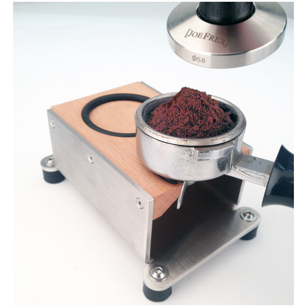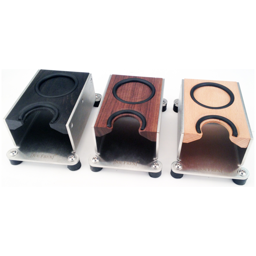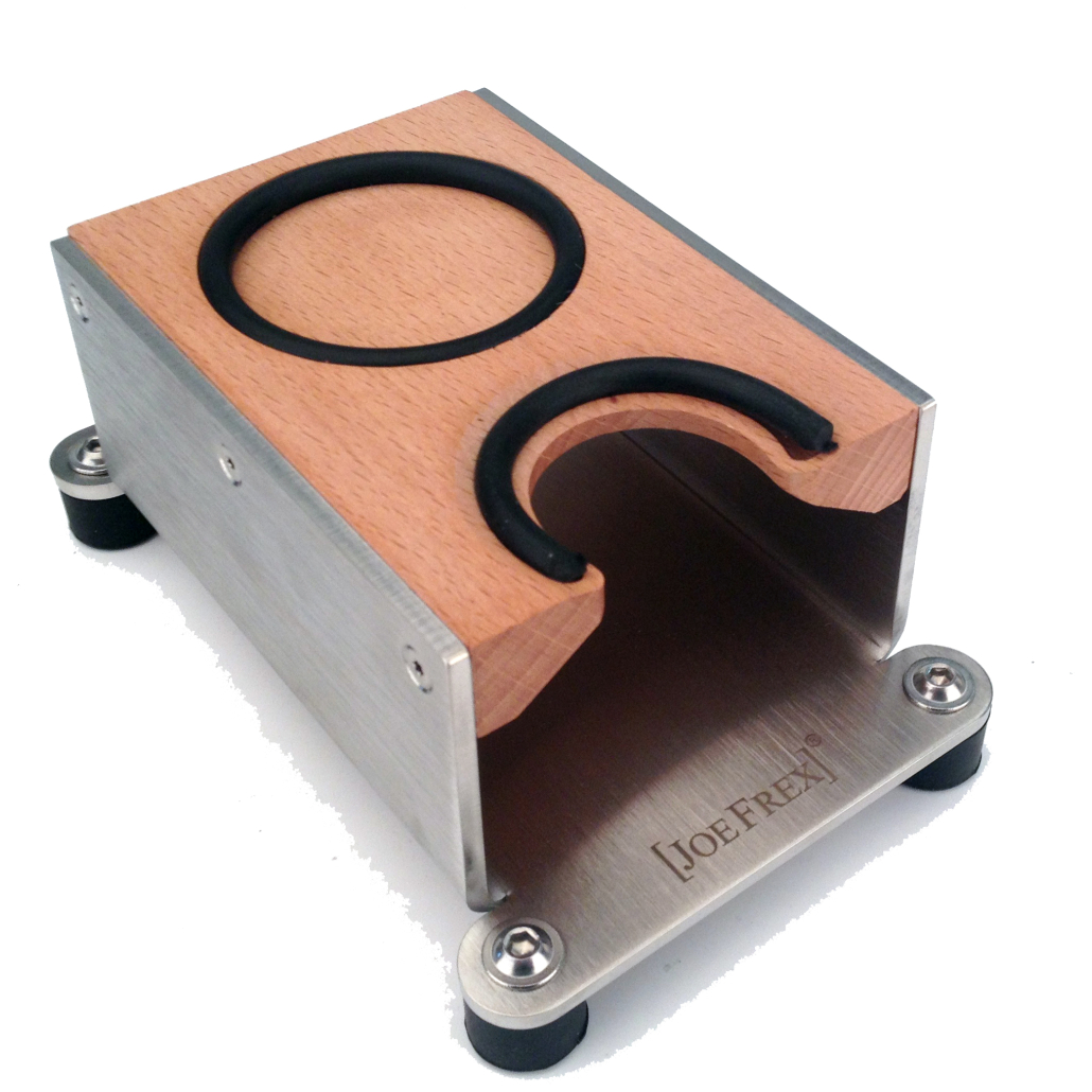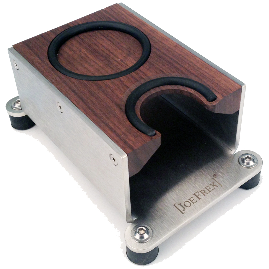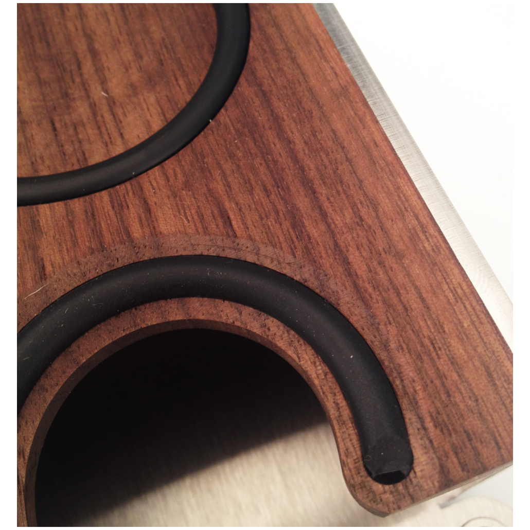 Unsere Tampingstation Exklusiv Nussbaum wurde im Hinblick auf verbesserte Nachhaltigkeit und Umweltverträglichkeit neu überarbeitet. . Der halbkreisförmige Ausschnitt vorn in der Auflage ist speziell passend für alle Siebträger eingearbeitet. Der Gummihalbring schützt Ihren Siebträger und bietet perfekten Halt und Stabilität beim Tampen. Auch im hinteren Teil wurde ein versenkter Gummiring eingearbeitet, der Ihrem Tamper nach Gebrauch einen idealen Stellplatz bietet. Das massive Gehäuse wird mit einem Laser aus vier Millimeter starkem Edelstahl herausgeschnitten und dann gekantet. Alle Kanten und Oberflächen werden von Hand sauber nachgeschliffen. Die Arbeitsplatte wird seitlich mit dem Metall verschraubt. Für einen sicheren Stand wurden vier massive Silikonfüsse mittels Edelstahlschrauben mit dem Korpus verbunden. Somit ist die Station kompakt, gebrauchstüchtig und bedienungsfreundlich. Um die Holzplatte nachhaltig wasserresistent zu halten, können Sie die Oberfläche jederzeit mit allen handelsüblichen pflanzlichen Ölen nachbehandeln.